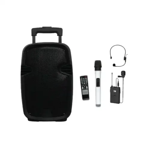 The CMX TS-12 Portable PA System is a trolly speaker system designed for various applications. The package includes 1 handheld/tie microphone, and 1 head microphone, offering flexibility for different scenarios. With a speaker size of 12" and a rated power of 180W, it delivers clear and dynamic sound. It supports Bluetooth connectivity, allowing you to wirelessly stream music from your devices. It also has a recording function, USB/SD socket for playing audio files, and inputs for wired microphones and guitars. Additionally, it includes an external battery jack for extended power options. The CMX TS-12 comes with two VHF wireless microphones, providing convenient and reliable wireless operation. CMX TS-12 (1 Hand + 1 Head Mic) Portable PA System & Trolley Speaker is equipped with a built-in rechargeable battery with a capacity of DC 12V/4.5AH, ensuring a continuous work time of over 8 hours. The ABS strong cabinet is designed for outdoor use, offering durability and protection. The panel of the CMX TS-12 features intuitive controls for easy operation. It includes mode selection for switching between Bluetooth, USB, and external audio modes. The recording function allows you to play and select recorded content. The microphone priority function enables the prioritization of microphone audio, and the last song/next song buttons control Bluetooth or mp3 playback. Knobs for music bass, music treble, guitar volume, microphone volume, and main volume provide precise audio adjustments. The system also offers AUX input, USB interface for mp3 playback and charging, power switch, guitar and microphone inputs, LED display for function and digital information, AC input, and an external battery connection for additional power options.