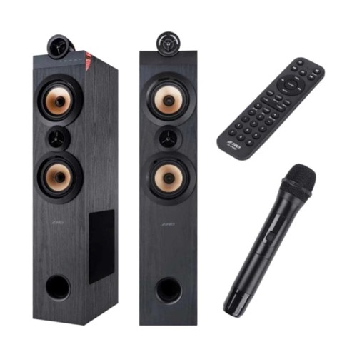 F&D T-70X Tower Speaker is ideal for a home theater setup. It has a 160 Watt RMS power output. The speaker is a 3 way acoustic design with 1 inch silk dome tweeter, 5.25 inch woofer and 8 inch sub-woofer for each channel. Fenda T-70X Bluetooth Speaker is perfect for using with MP3, PC, TV & Smartphones and tablets. This speakers are a great way to listen to your smartphones tablet, USB players, MP3 player, PC, TV, CD, DVD, etc.The stylish Nice design looks as good as its sound. It has a frequency response rate from 20Hz up to 20 KHz. The signal to noise ratio is around 70dB. The Separation is around 45dB. with this performance, this speaker set is Designed to perfection. The powerful sound on wide range makes it ideal for a perfect cinema experience. It has an Elegant and nice wooden cabinet design. The speaker support HDMI ARC, Optical input, AUX audio input, Bluetooth and USB. It comes with a plug and play USB reader Card reader supporting MP3 and WMA dual formats audio decoding. It comes with a bright LED display with wide view angle. The speaker supports digital audio supporting through optical input.v These speaker sets have built-in FM which support digital PLL technology to bring uninterrupted FM experience. it has a maximum of 100 FM radio station storage with a karaoke function for enjoying home entertainment. Just like other F&D speakers it has a full function remote control. The product Dimension is 182 x 321 x 935 mm with a net weight of 23.4kg. These speakers comes with a 1 year of warranty.