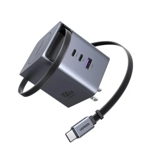 The UGREEN Nexode Pro X616 (65827) 100W GaN Charger With Type-C Cable is a high-performance, compact desktop power adapter engineered to deliver fast, reliable charging for laptops, tablets, smartphones, and other USB-powered devices with minimal bulk and maximum convenience. Built around advanced GaN (Gallium Nitride) technology, it achieves excellent energy efficiency and reduced heat generation compared to traditional silicon chargers, allowing a powerful 100 W total output from a relatively small chassis that’s ideal for home, office, or travel use. This charger includes a built-in retractable USB-C cable that supports up to 100 W charging, eliminating the need to carry extra cables and preventing tangles while also saving desk space, plus two additional ports (USB-C and USB-A) for simultaneous charging of multiple devices. Intelligent auto-power distribution ensures optimal wattage delivery to each connected device, and broad fast-charging protocol support (including PD 3.0, PPS, QC 4+, SCP, FCP, and AFC) ensures compatibility with a wide array of modern electronics—from MacBooks and Windows laptops to Android phones and tablets. Safety is prioritized with multi-layer protections against over-current, over-voltage, short circuits, and overheating, while the durable PC+ABS exterior in space gray offers long-lasting everyday use.