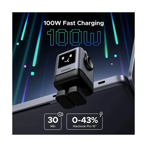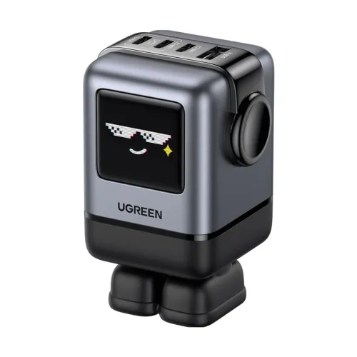 The UGREEN Nexode RG X688 (45514B) is a compact, high-power 100 W GaN fast charger designed to efficiently power multiple devices from a single wall outlet. Built with advanced GaN (Gallium Nitride) technology, it delivers powerful and stable charging while running cooler and more efficiently than traditional silicon chargers, making it ideal for modern laptops, tablets, smartphones, and accessories. The charger features a 4-port configuration—three USB-C ports and one USB-A port—allowing you to charge up to four devices simultaneously with intelligent power distribution that supports a range of fast-charging protocols like PD3.0, QC4+, QC3.0 and PPS for broad compatibility across most major brands and devices. Its unique robot-inspired design and TFT display adds a fun visual touch and provides real-time charging status, while built-in magnetic feet help secure it to metal surfaces so it won’t shift or fall. Multiple layers of safety protection guard against over-current, over-voltage, over-temperature, short circuits, and more, ensuring reliable daily use at home, in the office, or while traveling. With its sleek black finish and one-year warranty, the Nexode RG X688 combines reliable multi-device charging performance with a premium, user-friendly design.