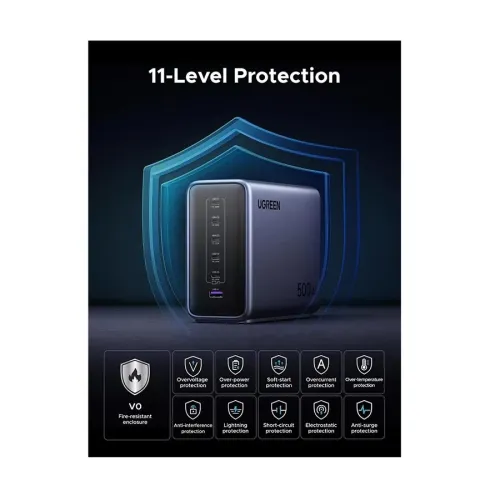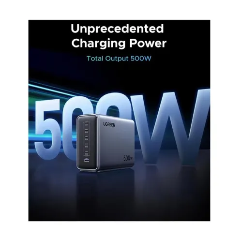 UGREEN Nexode X759 (55550B) 1‑Port USB & 5‑Port USB‑C 500W GaN Desktop Charging Station is an ultra‑powerful and versatile multi‑device charging powerhouse designed for users with heavy power needs and a busy tech lineup. Built with advanced GaNInfinity™ technology, this desktop charging station delivers a massive 500 W total output across six ports — five USB‑C and one USB‑A — making it capable of simultaneously fast‑charging laptops, tablets, phones, gaming consoles and accessories from a single outlet. The USB‑C1 port alone can deliver up to 240 W using USB Power Delivery 3.1, letting you charge high‑performance laptops such as gaming machines or professional notebooks at near‑maximum factory speeds, while the additional USB‑C ports can deliver up to 100 W and the USB‑A port up to 20 W for smaller gadgets. Support for a wide range of fast charging standards including PD 3.1, PPS and Quick Charge (QC 3.0) ensures broad compatibility with practically any modern device. Built‑in intelligent NTC temperature control continually adjusts heat levels to keep the unit stable under heavy loads, and extensive safety protections guard against over‑current, over‑voltage, short circuits and overheating for peace of mind. Featuring a space‑saving yet robust design with fire‑retardant housing and a long AC power cord, the Nexode X759 is ideal for desks, workstations, media centers or anywhere you need to keep multiple devices fully powered without piles of adapters.